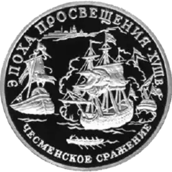 Reverse: three sailing ships and a boat at the Battle of Chesma, around: "Age of Enlightenment. 18th century.", bottom: "Battle of Chesma"