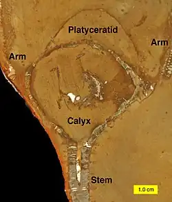 Platyceratids are known for the complex symbiotic relationships they had with crinoids.[3] Platyceratids are thought to have been parasitic on crinoids, either drilling into the stomach to steal the crinoid's food in a form of kleptoparasitism or drilling into the anal sac to feed on the gonads or the hindgut.[3][4] Previous authors have suggested that platyceratids were commensalists which fed on crinoid fecal matter without harming the crinoid, but more recent studies have shown that platyceratids did have a negative effect on their crinoid hosts as would be expected if they were actively parasitic.[5] It has been suggested that the large spines present on many species of crinoids served to deter predators who might damage or harm the crinoid in an effort to feed on the platyceratid snails infesting it.[4]