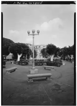 In addition to the cathedral and the firehouse, Plaza Degetau at one point also contained an open dining Moorish-style kiosk that had been part of the 1882 Fair Exposition.[15] The kiosk was still present at the time of the American invasion of the island in 1898 as reported by American photo-journalist William Dinwiddie,[16] but it was demolished in 1914.[17]