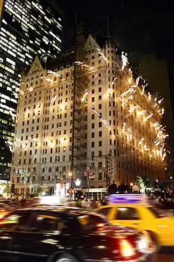 The detail of the facade is concentrated on its two primary elevations, which face north toward Central Park and east toward Fifth Avenue.[3][9][26] The facade's articulation consists of three horizontal sections similar to the components of a column, namely a base, shaft, and crown.[3][9][27] The northern and eastern elevations are also split vertically into three portions, with the center portion being recessed. The northeastern and southeastern corners of the hotel contain rounded corners, which resemble turrets. There are numerous loggias, balustrades, columns, pilasters, balconies, and arches repeated across various parts of the facade.[3][9][26] The 1921 annex contains a design that is largely similar to Hardenbergh's 1907 design.[28]