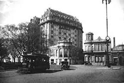 The Plaza was developed by local landowner and banker Ernesto Tornquist, in anticipation of the crowds of tourists expected for the 1910 Argentina Centennial celebrations.[7] Facing San Martín Square, the nine-story hotel was designed by German born architect Alfred Zucker and built at the northern end of Florida Street. It was inaugurated as the Plaza Hotel on July 15, 1909 (soon after the death of Tornquist),[5] with the presence of President José Figueroa Alcorta. Tornquist died in 1908 and did not live to see his hotel in operation.[8]