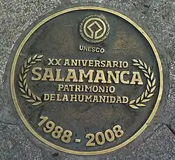 In 1988, UNESCO declared the old city of Salamanca a World Heritage Site. Today, there is a plaque placed in the center of the plaza marking its significance to boast the plaza's baroque-style beauty. Salamanca is known as La Dorada, "The Golden City" because of the glow of its sandstone buildings, which the Plaza Mayor represents at its core.[8]