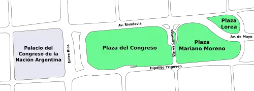 Plaza del Congreso (English: Congress Square) is a public park facing the Argentine Congress in Buenos Aires. The plaza is part of a 3 hectare (7.5 acre) open space comprising three adjoining plazas to the east of the Congress building. The Kilometre Zero for all Argentine National Highways is marked on a milestone at the plaza.
