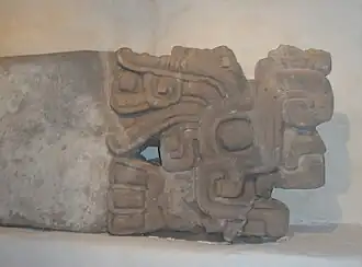 The marker found at the eastern side of the court, depicts attributes of the ancient rain gods, reiterating their association with fertility. This is expressed by the feather headdress, eye circles, the spiral depicting a mouth, the coiled nose, gums with teeth and the lower jaw.[1]