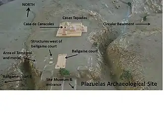 Plazuelas is a prehispanic archaeological site located just north of San Juan el Alto, some 2.7 kilometers (1.7 miles) north of federal highway 90 (Pénjamo-Guadalajara), and about 11 kilometers (6.8 miles) west of the city of Pénjamo in the state of Guanajuato, Mexico.[1] The site is open to the public; it is dominated by a large, rectangular plaza with several pyramidal structures and platforms, along with a massive ball court. To the north of the structures is a field of boulders with thousands of glyphs carved into them.