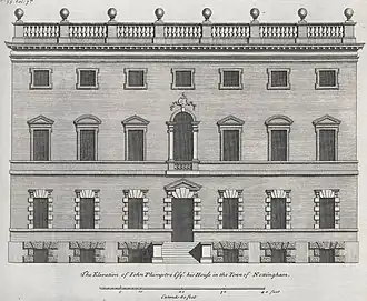 The house was located on the corner of what is now Keyes Walk and Stoney Street in Nottingham, adjacent to the churchyard of St Mary's Church. The family had occupied the site since at least the thirteenth century. John Plumptre (b. 1679) inherited the house from his father Henry in 1693.[1] The house was remodelled between 1724 and 1730 to the designs of Colen Campbell.[2]