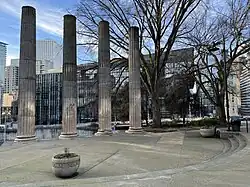 The church's columns were removed in March 1966 and sold to local businessman and art collector John Hauberg.[2] They were gifted by Hauberg to the city, who announced plans to erect them on a triangular plot of state-owned land overlooking Interstate 5.[3] The columns were installed in April 1967 and the land was transferred to the Seattle Parks Department.[4] The monument was formally dedicated on October 24, 1967, and for decades framed views of Pike Place Market and the Space Needle until nearby development blocked them.[2][5] Plymouth Pillars Park was rededicated in January 2006 and was previously known unofficially as Four Pillars Park.[6]