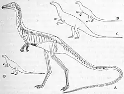 Since few other small theropods were known at the time Podokesaurus was described, it was mainly compared to the later genera Compsognathus, Ornitholestes, and Ornithomimus, which were thought related. Due to the fragmentary nature of the Podokesaurus specimen and the fact that it is lost, the identity and shape of some of its bones are today unclear. As only casts of the specimen now remain, it is only possible to get a general impression of the preserved skeleton and its proportions. Talbot identified bone fragments next to the tail as skull bones because two of them were bilaterally symmetric, and one was broadly convex with a sulcus (or furrow) at the midline, and according to Lull, was possibly placed at the upper wall of the skull, not far from the frontal bones. Lull thought other of these elements may have been part of the nasal bones.[6][17] Von Huene instead interpreted these bones as caudals from the middle of the tail.[7]