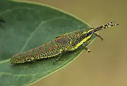 Poekilocerus pictus, the painted grasshopper, aak grasshopper or ak grasshopper, is a fairly large and brightly coloured species of grasshopper found in India, Pakistan and Afghanistan, especially in drier regions.[1][2][3] Both adults and nymphs are toxic; the nymphs are notorious for being able to squirt a jet of noxious liquid at up to around 30 cm (1 ft) away when grasped.[4][5]