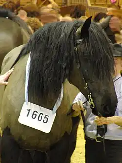 The Poitevin (French pronunciation: [pwat(ə)vɛ̃]) or Poitou is a French breed of draft horse. It is named for its area of origin, the former province of Poitou in west-central France, now a part of the region of Nouvelle-Aquitaine. It was formed in the seventeenth century when horses of Flemish or Dutch origin, brought to the area by engineers working to drain the Marais Poitevin, interbred with local horses. Although it has the size and conformation of a draft horse, the Poitevin has never been bred for draft abilities, and has been little used for draft work. Its principal traditional use was the production of mules. Poitevin mares were put to jacks of the large Baudet du Poitou breed of donkey; the resulting Poitevin mules were in demand for agricultural and other work in many parts of the world, including Russia and the United States.[4]: 271 In the early twentieth century there were some 50,000 brood mares producing between 18,000 and 20,000 mules per year.[5]: 156