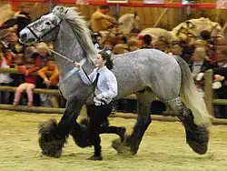 Poitevin colts and fillies were sold at fairs in Marans, Nuaillé, Surgères, Rochefort, Pont-l'Abbé and Saujon.[6]: 396 In 1867, there were 50,000 pure and crossbred mares.[14]: 18 By the early twentieth century, there were tens of thousands of Poitevins in France,[15]: 125 but numbers later fell.[14]: 18 Poitevin colts, which were not used for the breeding of mules, were considered "soft" and less valuable than the major draft horse breed of the nineteenth century – the Percheron. Some horse dealers purchased young gray Poitevin horses, fed them heavily to make them larger and stronger, and then sold them at the age of four as Percherons. These "Percherons" were transported to areas such as Saintonge, Yonne, Nivernais and Gâtinais.[20]: 533