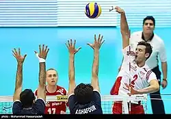 Left-wing attack from Winiarski at FIVB World League 2014 against Iran.