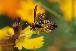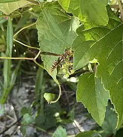 Polistes exclamans, the Guinea paper wasp, is a social wasp and is part of the family Vespidae of the order Hymenoptera.[2] It has been found in Ontario, Canada and the eastern United States from Illinois down south to Florida and west to Nebraska and California. It is also found in Mexico from Chihuahua to Jalisco, Hidalgo.[3] P. exclamans has shown variability in its range including an absence of the species in eastern Missouri from the 1920’s to 1940’s, a presence in the 1960’s to 1980’s, and an apparent absence again of the species in these same sites in eastern Missouri since 1989. This suggests that their range has either expanded northward and contracted southward or that they have large, long-term cycles of abundance.[4] P. exclamans has three specific castes, including males, workers, and queens, but the dominance hierarchy is further distinguished by age. The older the wasp is, the higher it is in ranking within the colony.[5] In most P. exclamans nests, there is one queen who lays all the eggs in the colony. The physiological similarities between the worker and queen castes have led to experiments attempting to distinguish the characteristics of these two castes and how they are determined, though males have easily identifiable physiological characteristics. Since P. exclamans live in relatively small, open combed nests, they are often subject to predators and parasites, such as Chalcoela iphitalis, Elasmus polistis, and birds. P. exclamans have defense and recognition strategies that help protect against these predators and parasites.