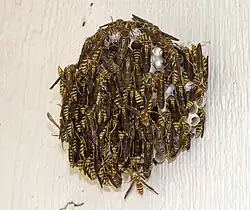 Many Polistes species aggregate over winter. P. exclamans clump in rather large aggregations while hibernating.[25] “These aggregations are frequently found in protected places called hibernacula that can be as varied as crevices and cracks of rocks or trunks, beneath the bark of trees, between walls of buildings, or any other natural or artificial structures that provides protection during hibernation.”[25] Although P. exclamans have been found in organ-pipe muddauber nests, a mud nest that can provide a certain level of protection, it is not thought to actually house hibernating P. exclamans over the winter.[25]