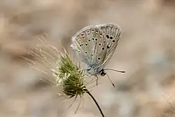 Polyommatus nivescens, the mother-of-pearl blue, is a species of butterfly in the family Lycaenidae. It is found in Spain.[1] It is a small butterfly is sexual dimorphic. The upperside of the male is very clear, with just a bluish beige reflection bordered by a thin grey line and a marginal line of small grey dots. The female upperside is brown, decorated with a marginal line of large orange maculae bordering the hindwings and part of the forewings. Both have a white fringe. The underside is light ochre marked with a marginal line of white lunules topped with orange, and adorned with a line of black dots circled in white very marked on the fore.