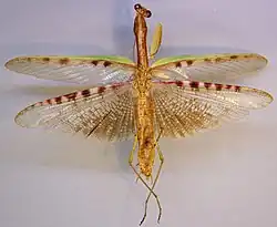 Polyspilota aeruginosa, common name Madagascan marbled mantis, is a species of praying mantis native to Africa. Adult females reach 8 centimetres (3.1 in) in length while males are smaller around 6 to 7 cm.[1]