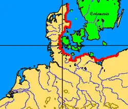 The shores of Codanus sinus (southwestern Baltic Sea) in red with its many islands in green
