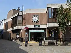 The present library is situated on Shoemarket and was opened in 1975 to a design by disgraced Pontefract architect, John Poulson.[3] The library was one of Poulson's final buildings, opening two years after his imprisonment for corruption. The building is of two storeys, the first floor being a mezzanine. The interior is clad in wood with a central staircase linking the ground floor with the mezzanine. The ceiling has square skylights situated over the central atrium. The exterior has the characteristic geometric shapes of Poulson's earlier brutalist style buildings, however unlike his earlier works the pre-cast concrete is finished. The windows are tinted to protect the stock and extrude from the building. The library is the only public library in the town.