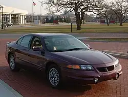 The 2000 Bonneville was restyled, using GM's G platform,[32] with the widest overall track in its competitive class at 62.6 in (1,590 mm) up front and 62.1 in (1,580 mm) in the rear. GM's StabiliTrak stability control system was introduced on the top-of-the-line supercharged SSEi model, later replaced by the GXP.