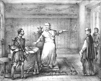 Though he was well aware upon his accession of the political pressures within the Papal States, Pius IX's first act was a general amnesty for political prisoners, despite the potential consequences. The freed revolutionaries resumed their previous political activities, and his concessions only provoked greater demands as patriotic Italian groups sought not only a constitutional government – to which he was sympathetic – but also the unification of Italy under his leadership and a war of liberation to free the northern Italian provinces from the rule of Catholic Austria.[46] By early 1848, all of Western Europe began to be convulsed in various revolutionary movements.[47] The Pope, claiming to be above national interests, refused to go to war with Austria, which reversed Pius' popularity in his native Italy.[46] In a calculated, well-prepared move, Prime Minister Rossi was assassinated on 15 November 1848, and in the days following, the Swiss Guards were disarmed, making the Pope a prisoner in his palace.[48] However, he succeeded in escaping Rome several days later.