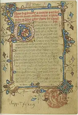 Fifty-seven manuscripts of the Pore Caitif have been identified, of which 54 are extant. Only 30 of these copies are full texts.[4] The earliest manuscripts are three that are nearly contemporary with the work: New York, Public library, MS De Ricci 68; Paris, Bibliothèque Nationale de France, MS Anglais 41; and Oxford, Bodleian Library, MS Douce 13.[5][6] Several manuscripts contain alterations and interpolations to bring the text into line with the theology of John Wycliffe.[7] These seven "heterodox" manuscripts are known as the Lollard group and include Anglais 41.[8]