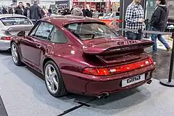 The 993 Turbo coupé was introduced in 1995. It featured a new twin-turbocharged engine displacing 3.6 liters and generating a maximum power output of 300 kW (408 PS; 402 hp).[18] Air-to-air intercoolers, electronic engine management, redesigned cylinder heads, and other modified engine internals completed the new engine. The 993 Turbo was the first 911 Turbo with all-wheel drive, taken from the 959 flagship model.[19] The Turbo's bodywork differs from the Carrera by widened rear wheel arches (about 6 cm), redesigned front and rear bumper moldings, and a fixed "whale tail" rear wing housing the intercoolers. New 18-inch (460 mm) alloy wheels with hollow spokes were standard.[20]