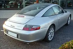 The 996 was initially available in a coupé or a cabriolet (Convertible) bodystyle with rear-wheel drive, and later with four-wheel drive, utilising a 3.4 litre flat-6 engine generating a maximum power output of 221 kW (300 PS; 296 hp).[5] The 996 had the same front end as the entry-level Boxster. After requests from the Carrera owners about their premium cars looking like a "lower priced car that looked just like theirs did", Porsche redesigned the headlamps of the Carrera in 2002 similar to the high performance Turbo's headlamps. The design for the initial "fried egg" shaped headlamps could be traced back to the 1997 911 GT1 race car.[6]