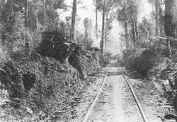 The construction started in 1917. In 1921 more than 1.6 km (1 mi) long section of track has been completed,[5] and this has been extended by 1925.[6] The screws of the trestle bridges were made locally by the blacksmith of Port Craig. He forged every morning a head onto either side of a batch of 200 bolts. He made these from round bars, which had been originally twice as long. Subsequently, he heated them up again and split these into two parts with a sledge hammer and a cold chisel. The teacher of the camp's school, who was employed by the sawmilling company helped him in the afternoon after finishing his classes by cutting the thread onto the bolts. The quality was high, because every bolt which exceeded the nominal length by more than one inch (25 mm) was rejected.[3]