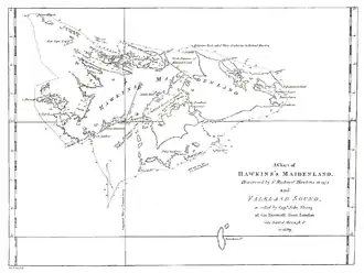 6. ^ J. MacBride. A chart of Hawkins’s Maidenland, discovered by Sr. Richard Hawkins in 1574 and Falkland Sound, so called by Capn. John Strong of the Farewell from London who sailed through it in 1689. Scale 1:1000000. In: An account of the voyages undertaken by the order of His present Majesty for making discoveries in the Southern Hemisphere. Eds. J. Hawkesworth and J. Byron. Vol. I. London: W. Strahan and T. Cadell, 1773 (following p. 40)