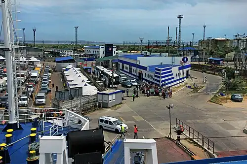 The port is able to handle vessels up to 130 metres (430 ft) in length, 14.5 metres (48 ft) in breadth and with draft up to 5 metres (16 ft).[2] It was the eastern terminal of the railroad and car Kerch Strait ferry line connecting Krasnodar Krai with Crimea (the western terminal of the ferry line is Port Krym). It is served by a railway line and the Port Kavkaz railway station. The southern zone of the port has been under renovation to increase the port's throughput to 4 megatonnes (3,900,000 long tons; 4,400,000 short tons).