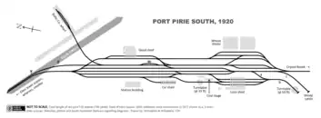 | In 1967, 91 years after its construction, everything around the original Port Pirie South building had changed, including new standard-gauge tracks serving the just-opened Mary Elie Street station (left). | Track layout of Port Pirie South in the 1920s – all narrow-gauge. Broad and standard gauges were added in 1937. |