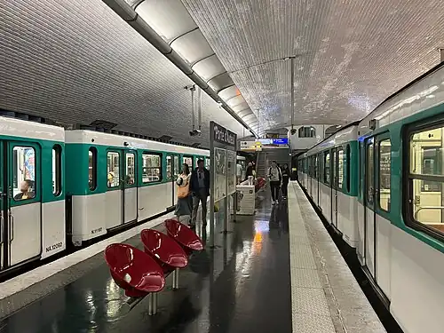 MF 67 rolling stock at Porte d'Auteuil. Left track is for regular traffic (toward Boulogne – Pont de Saint-Cloud), central track is a connection with Line 9 to Porte de Saint-Cloud via Ateliers d'Auteuil or Porte Molitor ; it's also used for direction to Gare d'Austerlitz via Michel-Ange – Molitor ; first train and during rush hours, trains will ride the turn-around track (nicknamed: Boucle d'Auteuil), third track is unused.