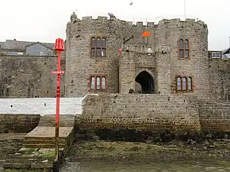 Porth yr Aur is a Grade I listed 13th-century fortification in Caernarfon which forms part of Caernarfon Castle's medieval defences. Originally known as the West gate, it was the main seaward entrance to the walled town. The building has been the home of the Royal Welsh Yacht Club since 1854.[1] Porth yr Aur forms part of the Castles and Town Walls of King Edward in Gwynedd UNESCO world heritage site.[2]