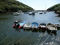 Porthclais harbour was built in the 12th century, importing coal and timber. The entire harbour is within the St David's Peninsula Site of Special Scientific Interest.[1] Porthclais is still used as a small port by local fishermen and recreational sailors. The largely intact old harbour wall may have been built by the Romans, and the harbour was mentioned in the mediaeval Mabinogion. The earliest recorded date of trade through the port is 1385.[2][3]