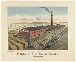 The Portland Star Match Company was incorporated in 1866 and its original owners sold the company in 1869. In October of that year, a fire burned at the factory's facility near Back Cove. Damage totaled $20,000 and nearly destroyed the original building.[2] The company relocated to West Commercial Street, where it built a new facility.