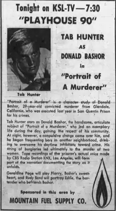 "Portrait of a Murderer" was an American television play broadcast on February 27, 1958, as part of the second season of the CBS television series Playhouse 90. Leslie Stevens wrote the teleplay, as an adaptation of a story by Abby Mann. Arthur Penn directed, Martin Manulis produced, and Dominick Dunne was an assistant to the producer. Tab Hunter and Geraldine Page starred. Hunter received an Emmy nomination for his performance.[1]