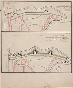 Over the years, constructions began to fully fortify the fortress hill. The pentagonal system began at the farthest point of the cape near south-east of the river mouth, towards the west of the Fortaleza. At this point two ramparts were built at right angles to each other lining the shores. The one running northward toward the river mouth was 130 fathoms in length to the bastion of São Pedro while the other one ran for 75 fathoms to the east, curving inshore, ending at the gate and bastion of Santiago.