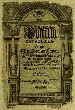 The Catholic Postil, That Is a Lay Out of Gospels for Every Week and Feast of the Entire Year (modern Lithuanian: Postila katolicka, tai esti išguldymas evangelijų kiekvienos nedėlios ir šventės per visus metus, original Lithuanian: Postilla catholicka, tái est Ižguldimas ewangeliu kiekwienos nedelos ir szwętes per wissús metús) was a collection of Roman Catholic sermons and Bible commentaries (postil) by Jakub Wujek translated from Polish to Lithuanian by Mikalojus Daukša and first published in 1599. It was one of the first Lithuanian-language texts published in the Grand Duchy of Lithuania. The work is valued by researchers for the purity of the Lithuanian language and for its Polish dedication that defended the use of the Lithuanian language in public life.[1] The 646-page postil remained the longest Lithuanian published work until the 19th century.[2]