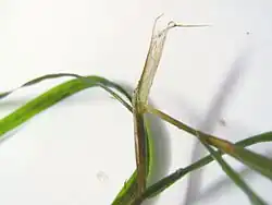 Potamogeton compressus produces a strongly flattened, robust, branching stem up to 90 cm in maximum length.[4] It grows annually from turions and seed, producing bushy plants branching near the surface with long, rather grass-like leaves that are 85–240 mm long and 3–6 mm wide and olive-green or dark green, sometimes with a reddish tinge near the surface.[4] Each leaf has two veins either side of the midrib and is bluntly pointed. The leaves have a rather opaque appearance compared to the transparent leaves of most pondweeds due to the presence of fibres called sclerenchymatous strands. There are no rhizomes or floating leaves.