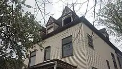 The Pottlitzer House at 801 Brown St. is in the historic Centennial Neighborhood in Lafayette, Indiana. This Pottlitzer house was constructed in 1893 by Leo and Minnie Pottlitzer.[1] It is a mixture of Colonial Revival, Chateau and Queen Anne styles. When constructed it cost $9000, about $260,000 in today's value.[2] The finials and oversized gables with low relief sculptures are indicative of the eclectic style popular in the late 19th century. The most notable feature, the tall spires on the roof, are the only known extant residential example of this style in Lafayette. The Pottlitzer House caught on fire in early 2015, severely damaging the rear of the structure.[3]