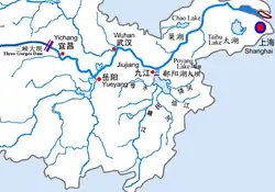 Poyang Lake is the largest freshwater lake in China.[4] Located within Jiujiang Prefecture in Jiangxi Province, it is fed by the Gan, Xin, and Xiu rivers and flows northward into the Yangtze River through a channel.