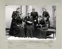 Members of Prairie Street Mennonite Church illustrating plain Mennonite clothing (back row, right: Elsie (Kolb) Bender, Harold S. Bender's mother).