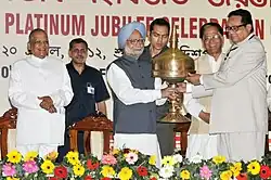 Gogoi presenting a memento to Prime Minister Manmohan Singh, with Chief Minister Tarun Gogoi and Governor Janaki Ballabh Patnaik.