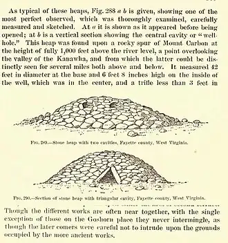 Loup Creek wall, "Trees of all sizes and varieties may be seen growing up through the heaps of loose stones which were once built into the wall. One of these which I particularly noticed was a red oak fully three feet in diameter and not less than four hundred years old. This would indicate that the wall had been abandoned at least that long if not longer. The mystery to be solved is who were the builders of this wall and why was it constructed. William Morris the first permanent settler of the county located in the vicinity of this wall in 1774 and his descendants claim that he was told by the Indians that the wall was there when the latter came into the Valley. It is quite clear to every inquiring mind that the Indians were not its builders but that it was no doubt constructed by the same race that built the mounds and inhabited the territory of the United States for centuries prior to its settlement by the Indians." Quote from George Wesley Atkinson, 1876 (Public Domain), Page 94, "History of Kanawha County: from its organization in 1789 until the present". - ^ Gage 2009:IV.