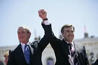 Georgia's NATO integration was most backed by the United States, although high-level officials in the Bush administration, namely Condoleezza Rice and Robert Gates were at odds with the White House's most ardent neoconservatives, including Vice-President Dick Cheney,[151] over when to grant the country the MAP.[c] On 14 February, the United States Senate passed Senate Resolution 439 urging the North Atlantic Alliance to grant both Georgia and Ukraine the MAP and President Bush gave his "unwavering support" on 19 March at a meeting with Saakashvili in the White House.[152] Shortly before the April Summit, the Bush administration issued a formal list of its positions, underling that "NATO must make clear that it welcomes the aspirations of Georgia and Ukraine for membership in NATO and offers them a clear path forward toward that goal."[153] During a visit to Kyiv on 1 April, Bush once again reiterated his backing for the two countries' NATO integration, believing that granting the MAP would protect them from a growing Russian threat, would encourage them to pursue democratic reforms, and would be a reward for their "courage in being able to confront Russia to join the Western bloc."[154] The United States was joined by a coalition of Central and Eastern European states in supporting granting Georgia the MAP, namely Lithuania, Latvia, Estonia, Slovakia, Slovenia, Bulgaria, Romania, Poland, and the Czech Republic, who lobbied the Bush administration for more active backing of Tbilisi and Kyiv,[155] as well as Denmark and Canada.[156]