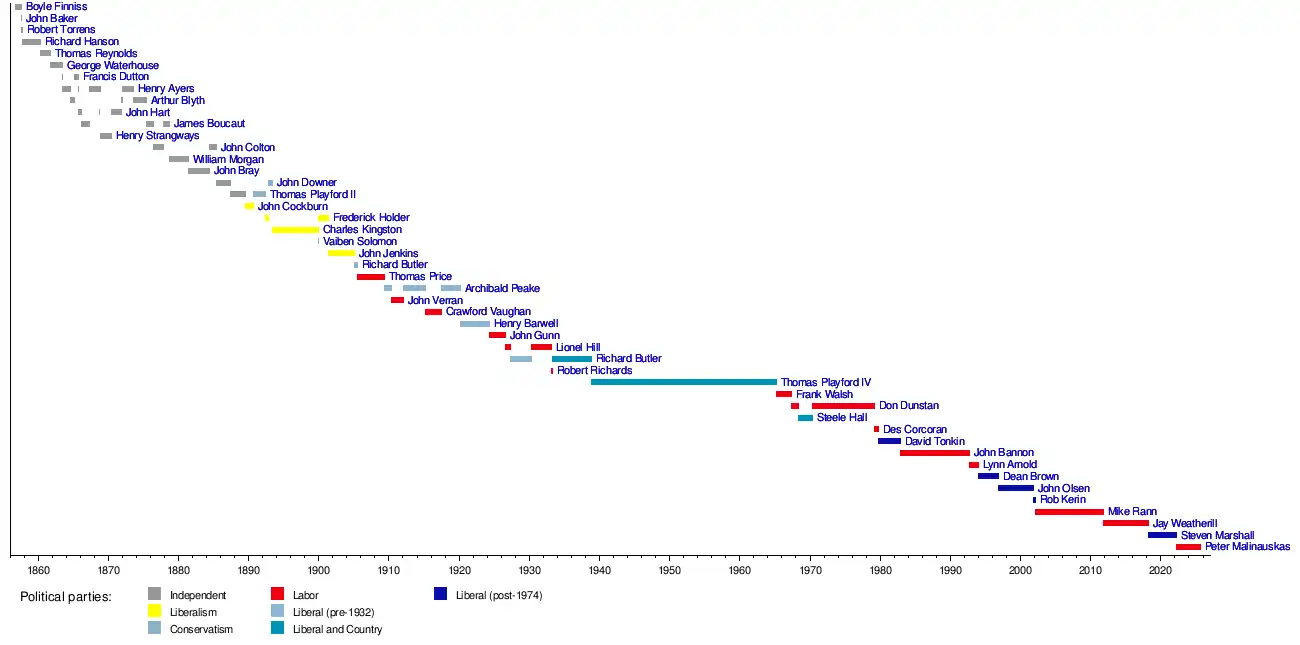 Peter Malinauskas is the current Premier, having served since 21 March 2022. Thomas Playford IV is the longest serving Premier, and the longest serving head of government in Australian history, serving for over 26 years from 1938 until 1965, holding on to power thanks the Playmander.