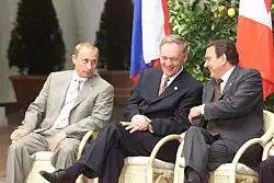 Chrétien meeting with President Vladimir Putin of Russia and Chancellor Gerhard Schroeder of Germany in July 2001.