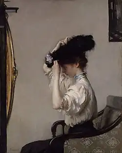 Born, raised, and educated in and around the Boston, Massachusetts area, Tarbell was interested in the lives of the women who lived in the area. Tarbell was the leader of the Boston School, a group of artists who painted women in interior and exterior settings, usually active in mundane, domestic activities. Using impressionist techniques, they bring to life these seemingly dull activities with their lively brushstrokes.[1] Tarbell concentrated on the world of upper-class women, depicting them elegantly in the latest fashions. These women exemplified the Boston Brahmin lifestyle.[2]