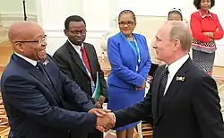 By July 2013, relations between Zuma's government and Mugabe's were tense, as Zuma and the South African Development Community took a harder line on the necessity of democratic reforms in Zimbabwe.[88] Yet, according to the Business Day, relations between the countries remained "cordial" throughout Zuma's presidency.[89] Mugabe and Zuma exchanged state visits, including in 2013, 2015, and 2017,[87][90][91] and Mugabe's successor, Emmerson Mnangagwa, visited South Africa in December 2017, shortly after his ascension to the presidency.[89]