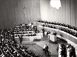 At the LCY Central Committee's 7th Session on 1 July 1968, it accepted the commission's proposal to expand the presidency to about fifty members and establish a smaller, non-political secretariat attached to it at the 9th Congress. This proposal was made because the presidency and the executive committee proved too large, and because of this, informal coordination groups were established to enforce policies. The LCY Central Committee also adopted a proposal to be sent to the 9th Congress for its own self-abolition and replacement with a conference. This, by extension, meant that the office of president of the LCY Central Committee was abolished and replaced with that of president of the LCY.[26] At the same session, the Commission for Cadre Policy of the LCY Central Committee proposed the abolition of the existing proportional representation formula approved by the 5th Session and institute equal representation of all republican branches in the presidency.[27] It also proposed a change to method of elections of presidency members. According to the commission, "it is natural that the deciding role in the nomination of members for the [Presidency] of the LCY belongs to the republican organisations of the League of Communists"; it proposed instituting a system in which candidates for the presidency would be nominated by the republican central committees, elected by the republican congresses and verified by the federal congress. The intention was to turn the individuals in question from presidency members who had come from a republic to "representatives of a republic in the central leadership".[28] The 7th Session approved these changes, and by the 9th Congress on 11–15 March 1969, Tito, in his function as LCY president, was the only remnant of an independent party centre. Until the 9th Congress, important decisions were no longer made at federal meetings but through ad-hoc meetings of republican representatives and interpersonal visits.[28]